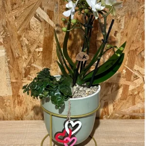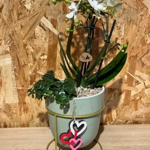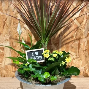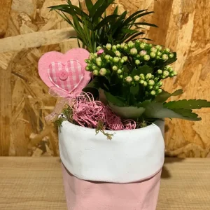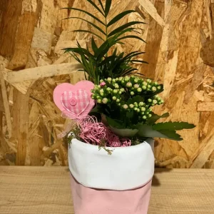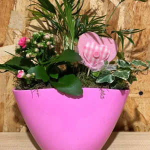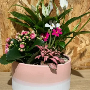 Cesta de flores en tonos rosáceos.