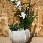 Preciosa composición de plantas que incluye una Phalaenopsis blanca, acompañada de suculenta y presentada en una base cerámica beige, de última colección. Esta combinación aporta elegancia y un toque natural a cualquier espacio interior, convirtiéndose en un elemento decorativo que combina estilo y frescura.