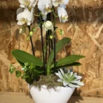 Preciosa composición de plantas que incluye una Phalaenopsis blanca de 3 varas en cascada, presentada en una base cerámica blanca. Esta combinación aporta elegancia y un toque natural a cualquier espacio interior, convirtiéndose en un elemento decorativo que combina estilo y frescura.