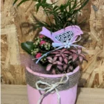 Preciosa composición de plantas realizada en una base de cerámica rosa con cuerda natural.