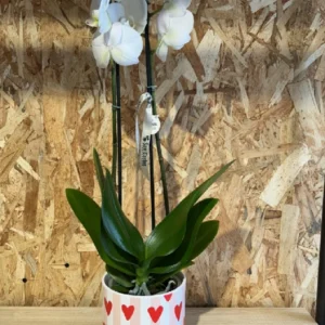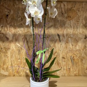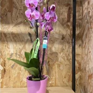 Impresionante centro de Orquídeas Phalaenopsis rosa acompañado de 4 plantas de interior, que hacen un arreglo inigualable.