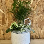 Composición de plantas presentada en una base cerámica blanca classic con repujado vintage. Su estilo simple y limpio se adapta fácilmente a cualquier espacio interior, aportando un toque natural y decorativo sin recargar el ambiente.
