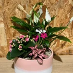 Preciosa composición de plantas presentada en una base cerámica en tono rosáceo y blanco, cuidadosamente diseñada para aportar elegancia, frescura y armonía a cualquier espacio interior. Incluye tres tipos de plantas de interior diferentes, destacando como protagonista un hermoso sphatifilium, reconocida por su resistencia, fácil mantenimiento y su capacidad de aportar un toque natural y sofisticado al ambiente.