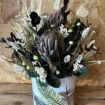 Precioso centro elaborado con flores secas y preservadas en tonos naturales, destacando protea, eucalipto spiral y parvifolia, sorghum, phalaris, amarelino y broom. Todo ello está dispuesto en una base de acero con motivos de helecho press, que aporta un toque original y hace resaltar la composición de manera armoniosa.