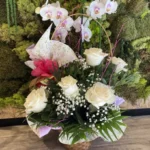 Espectacular cesta compuesta por una planta de Phalaenopsis, y 6 rosas blancas, acompañado con diferentes verdes tropicales.