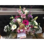 Preciosa cesta de mimbre elaborada con Lilium Oriental, Gerberas, Rosas y otras flores de temporada, acompañadas de verdes tropicales. Una combinación armoniosa de colores que resalta la belleza de cada flor y convierte la composición en un detalle elegante y delicado.