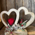 Hermosos corazones medianos de madera, decorados con dos delicados pájaros en metal y combinados con una rosa preservada, acompañada de flor seca y verdes preservados. Una composición elegante y armoniosa, diseñada para ser un regalo duradero que sorprenda y emocione en cualquier época del año.