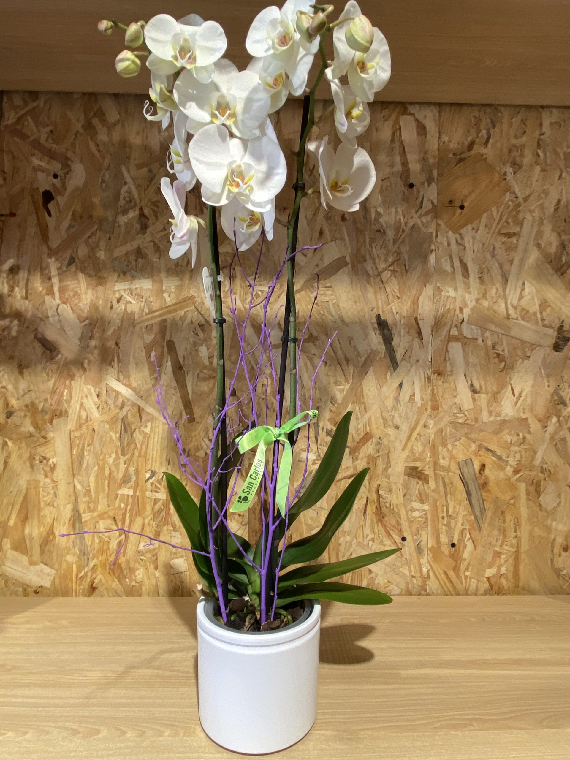 Espectacular Phalaenopsis blanca con dos varas de flor, ideal para decorar cualquier rincón interior de la casa, oficina o comercio. Su elegancia y delicadeza aportan un toque de frescura y luminosidad al ambiente, convirtiéndose en un elemento decorativo sofisticado y armonioso.