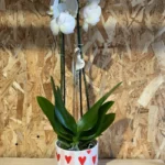 Esta composición incluye una maceta decorativa de corazones que complementa perfectamente el estilo delicado de la orquídea, creando un conjunto armonioso y listo para colocar en cualquier rincón del hogar o la oficina.