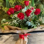 Impresionante ramo compuesto por 12 rosas rojas de alta calidad, acompañado de verdes tropicales y paniculata. Un detalle elegante y lleno de significado, ideal para expresar tus sentimientos sin necesidad de palabras.