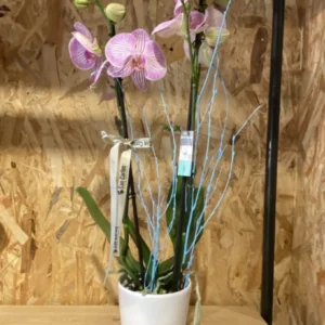 Se entrega con papel y lazo a juego de la composición, incluyendo sobre y tarjeta, lista para regalar directamente o colocar como decoración floral en cualquier espacio.