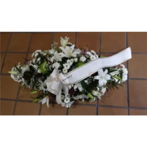 Se entrega con envoltorio transparente, lazo blanco y posibilidad de inscripción en cinta blanca o tarjeta de condolencias. Listo para colocarse en ceremonias, velatorios o el lugar que los familiares consideren más apropiado. Cada detalle se cuida para ofrecer una presentación elegante y respetuosa, mostrando consideración y sensibilidad hacia quienes reciben este gesto de apoyo.