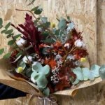 Precioso ramo en tonos verdes, marrones y naranjas, perfecto para quienes buscan un detalle elegante y diferente. Su combinación de colores transmite calidez y encanto otoñal, siendo un regalo original y moderno para cualquier ocasión.