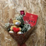 Rosa Roja Única acompañada de verdes tropicales, paniculata y birch, creando una composición elegante y llena de significado. Incluye un pick decorativo (igual a foto o similar) y un tierno peluche, convirtiendo este detalle en un regalo completo y emotivo.