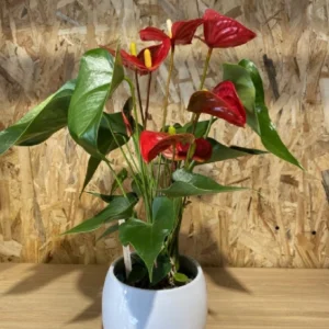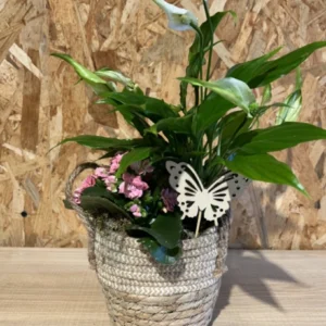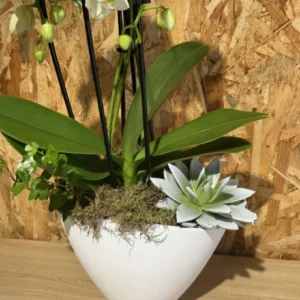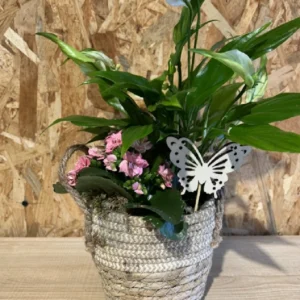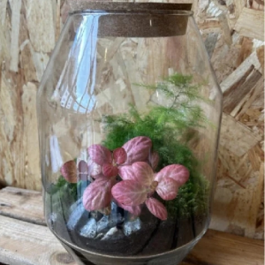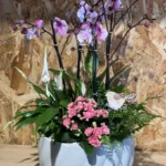 Impresionante centro de Orquídeas Phalaenopsis rosa acompañado de 4 plantas de interior, que hacen un arreglo inigualable.